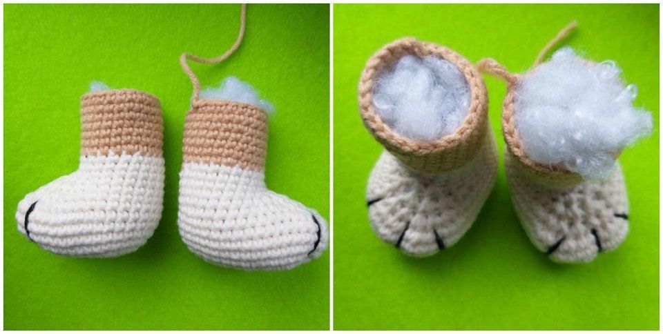 Начните поделку с лапок, свяжите две одинаковые лапки, а потом соедините их между собой.