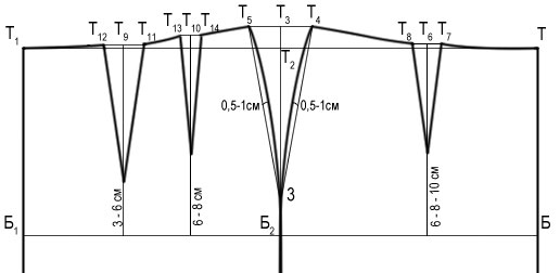 Оформление линии талии: Т5Т5′ = T6T6′ = 1?5 см. От точек Т7 и Т8 вверх — по 0,5 см, от точек Т9 и Т10 вверх — по 0,3 см. Соедините точки на талии, как изображено на чертеже. Внутри вытачек выступы должны быть длиннее сторон по оси на 1 — 1,5 см.